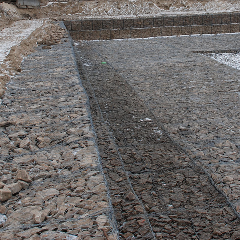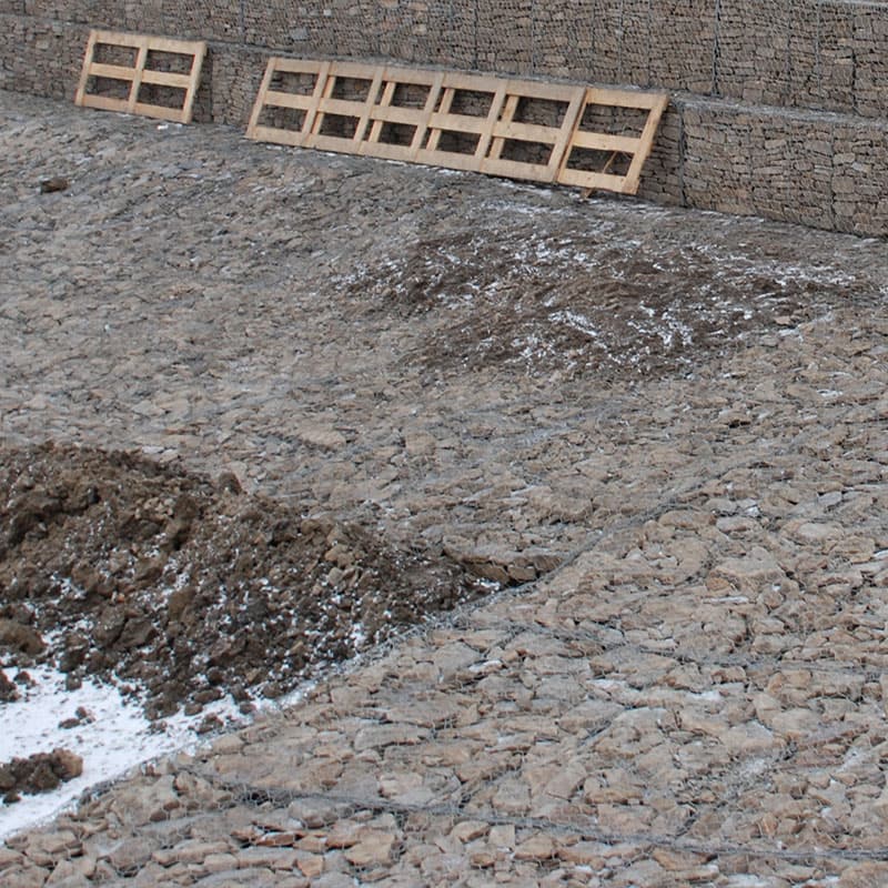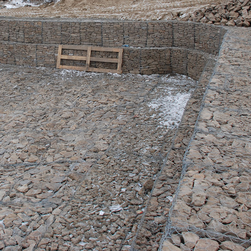 Пример применения: укрепление откосов и русел на типовых участках; заполнение камнем фракции крупнее 60х80, фиксация крышек и кромок после выверки отметок.
