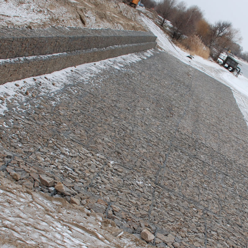 Пример применения: укрепление откосов и русел на типовых участках; заполнение камнем фракции крупнее 60х80, фиксация крышек и кромок после выверки отметок.