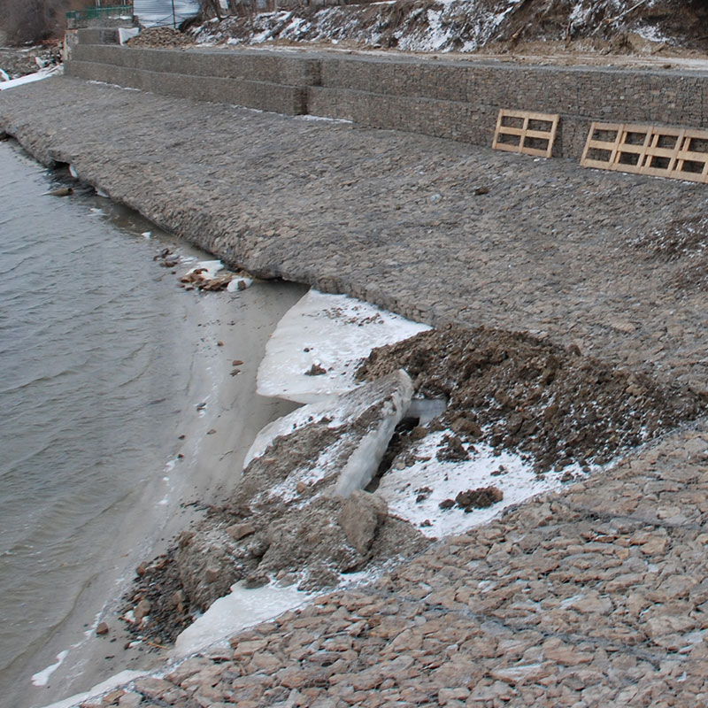 Пример применения: укрепление откосов и русел на типовых участках; заполнение камнем фракции крупнее 60х80, фиксация крышек и кромок после выверки отметок.