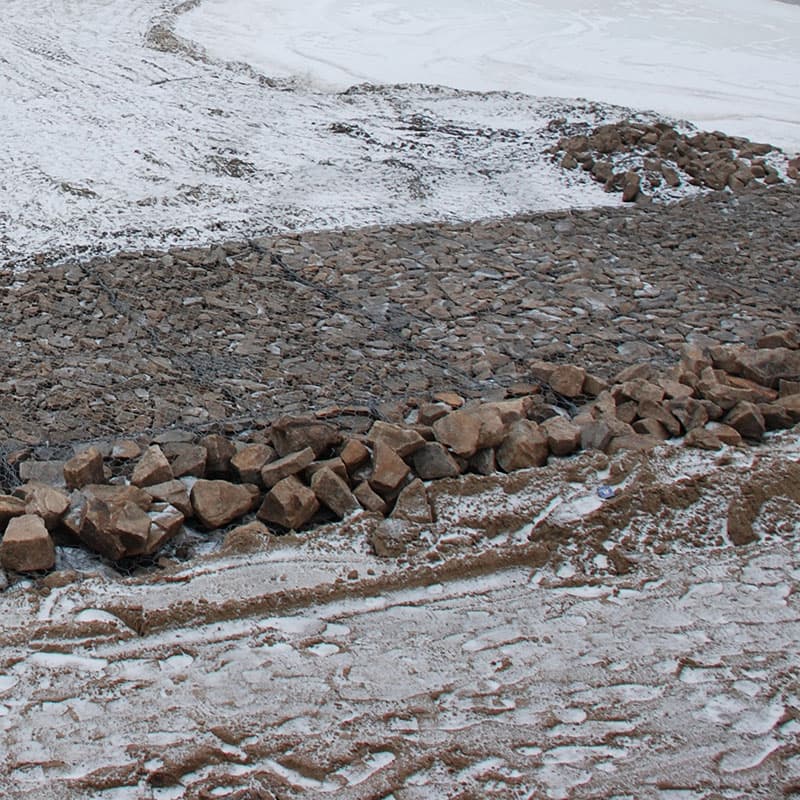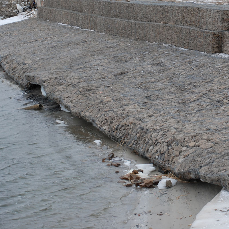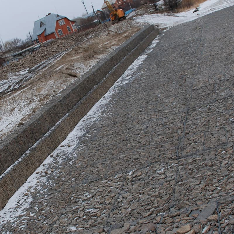 Пример применения: укрепление откосов и русел на типовых участках; заполнение камнем фракции крупнее 80х100, фиксация крышек и кромок после выверки отметок.