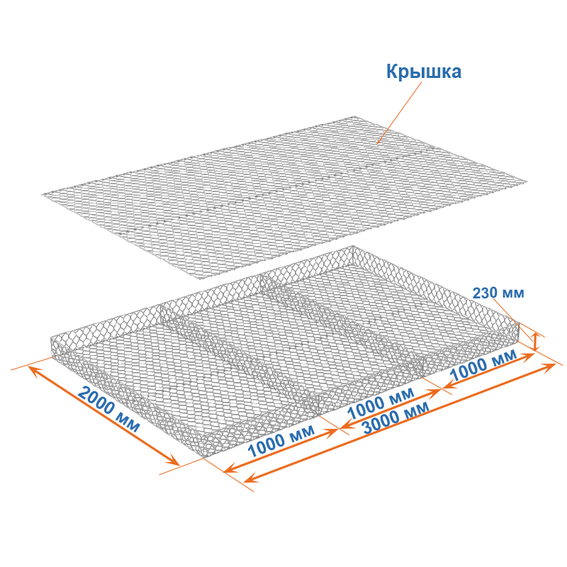 Матрасы Рено 3x2x0,23 — плоские габионные секции из сетки двойного кручения с ячейкой 60х80, проволокой 2,2 мм и покрытием Цинк.