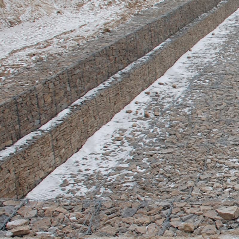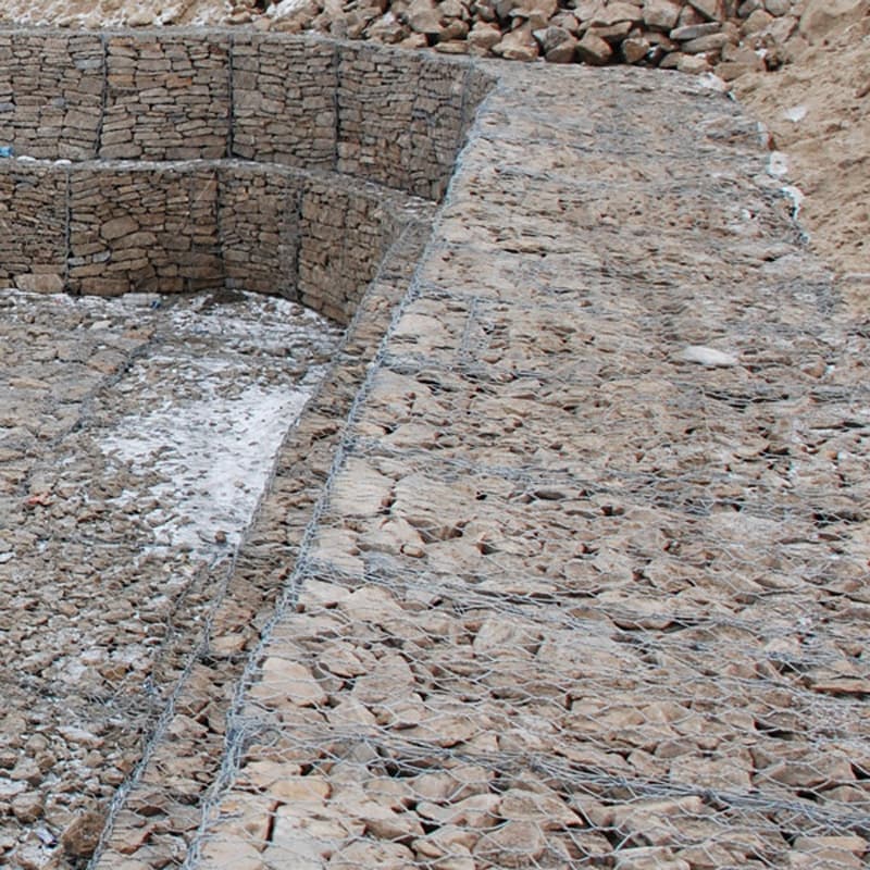 Пример применения: укрепление откосов и русел на типовых участках; заполнение камнем фракции крупнее 80х100, фиксация крышек и кромок после выверки отметок.