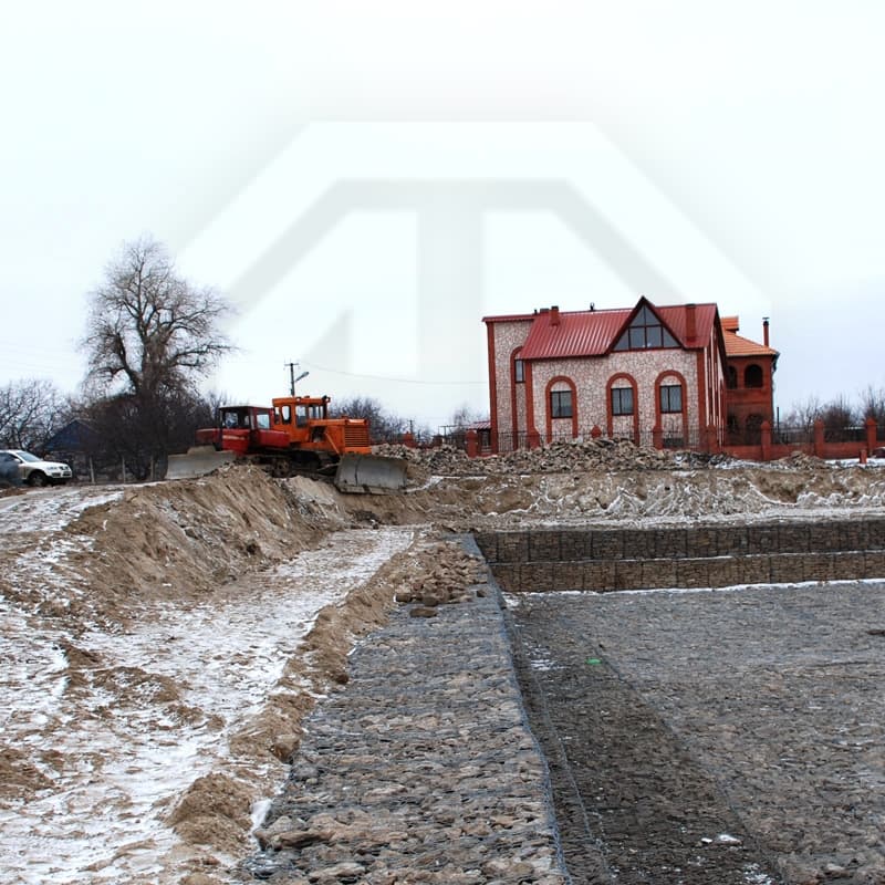 Пример применения: укрепление откосов и русел на типовых участках; заполнение камнем фракции крупнее 60х80, фиксация крышек и кромок после выверки отметок.