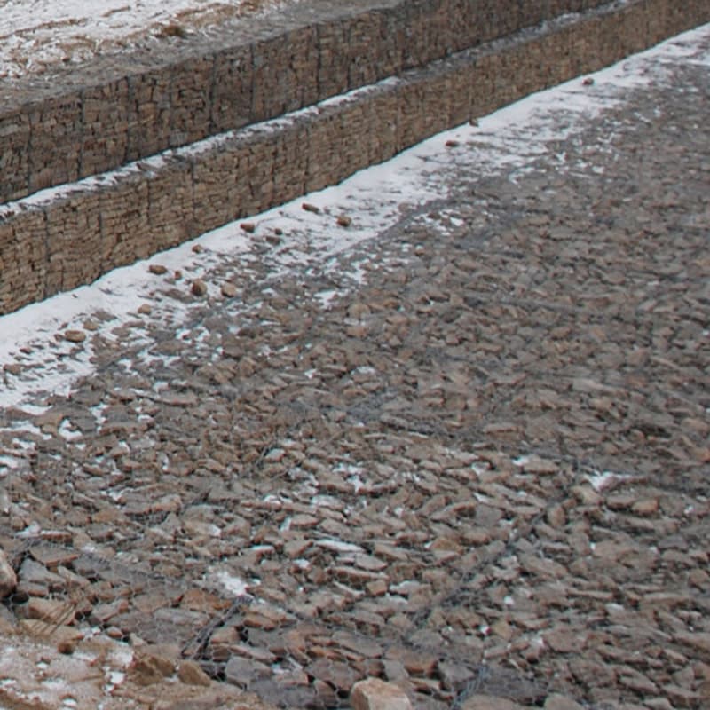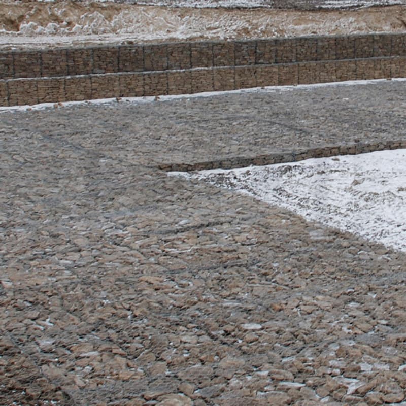 Пример применения: укрепление откосов и русел на типовых участках; заполнение камнем фракции крупнее 80х100, фиксация крышек и кромок после выверки отметок.
