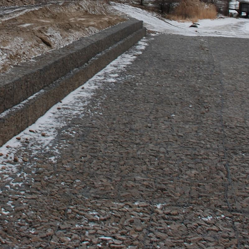 Пример применения: укрепление откосов и русел на типовых участках; заполнение камнем фракции крупнее 80х100, фиксация крышек и кромок после выверки отметок.