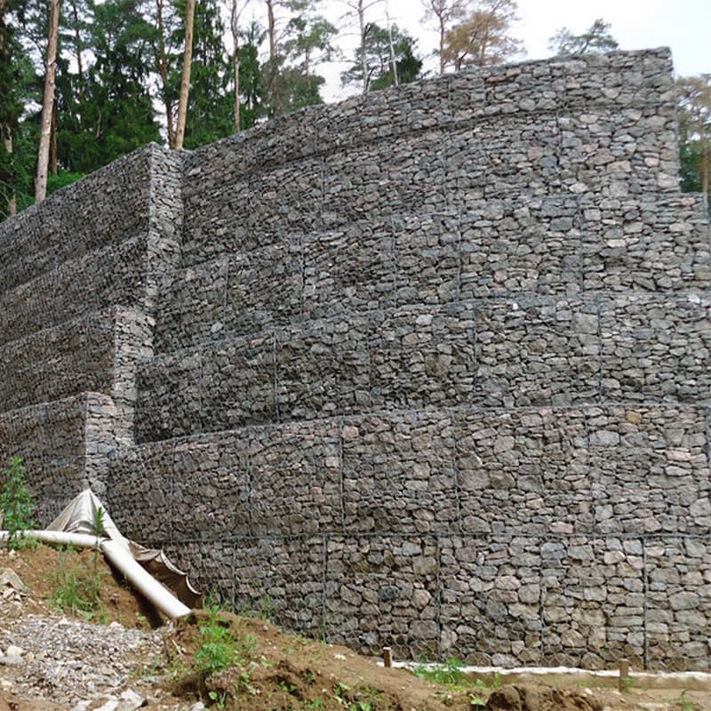 Используются габионы с армирующей панелью 5x2x0,5 при создании укрепляющих сооружений, противоселевых и противокамнепадных. Также, широкое применение они находят при организации подпорных стен.