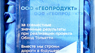 За вклад в строительство обхода г. Тольятти компания «Геопродукт» была награждена АО «ДСК «Автобан» благодарственной статуэткой «За совместные значимые результаты при реализации проекта Обход Тольятти».