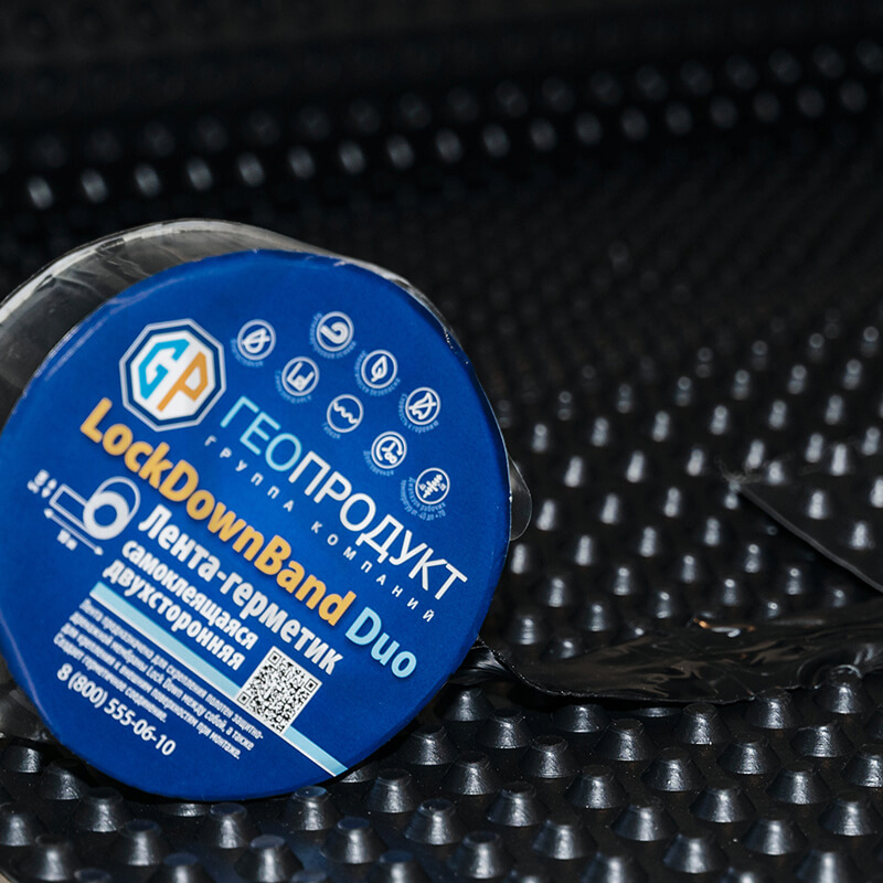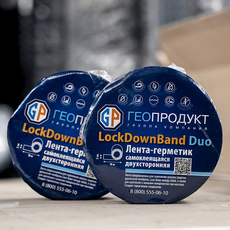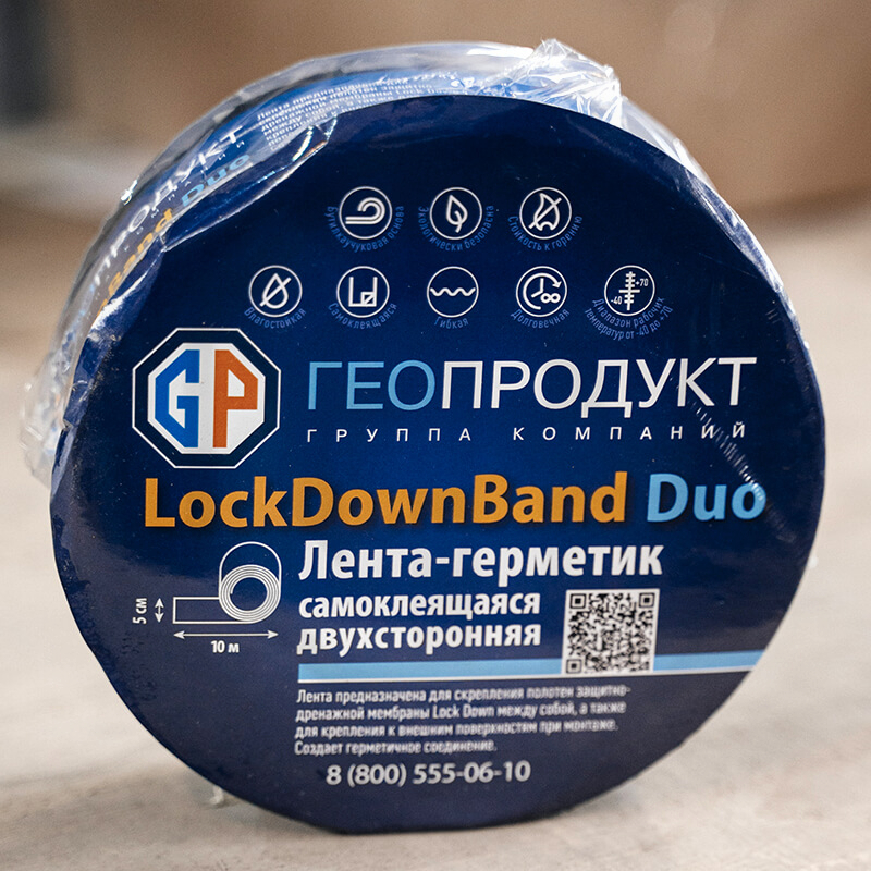 LockDown Band DUO – двухсторонняя герметизирующая лента, предназначенная для скрепления полотен защитно-дренажной мембраны LockDown между собой, а также для их крепления к внешним поверхностям при монтаже.