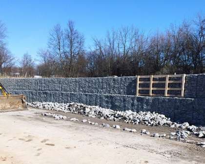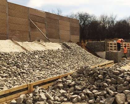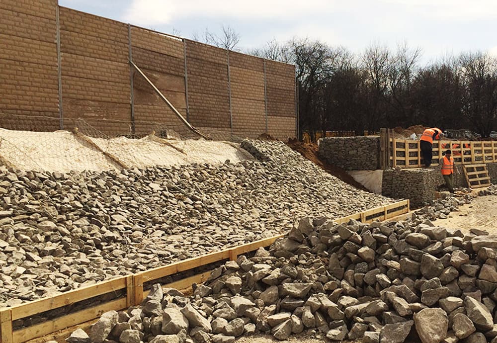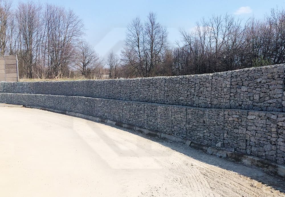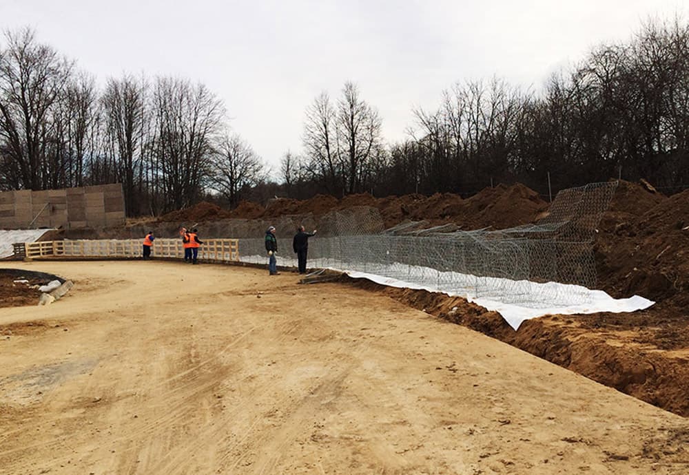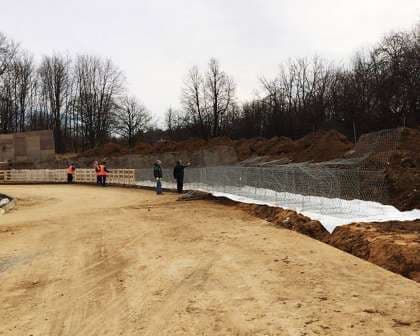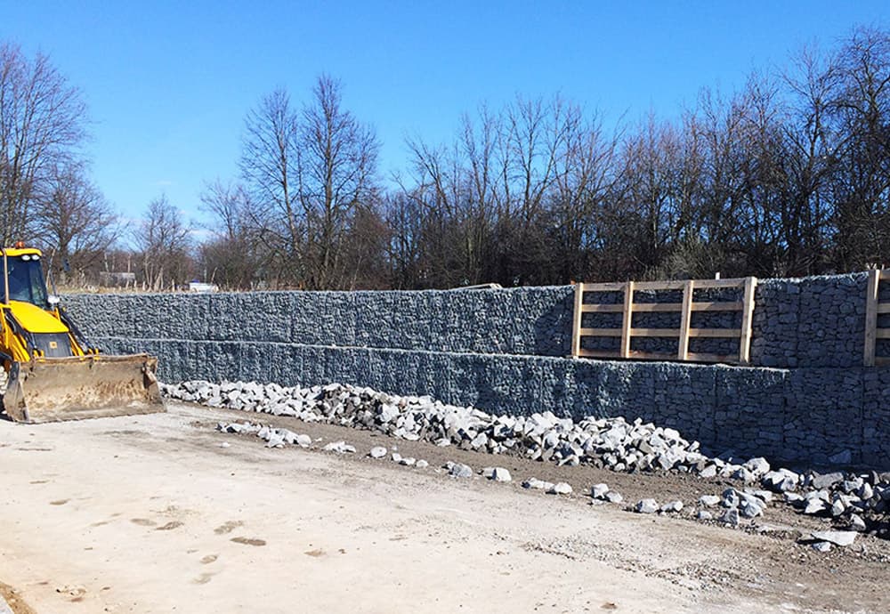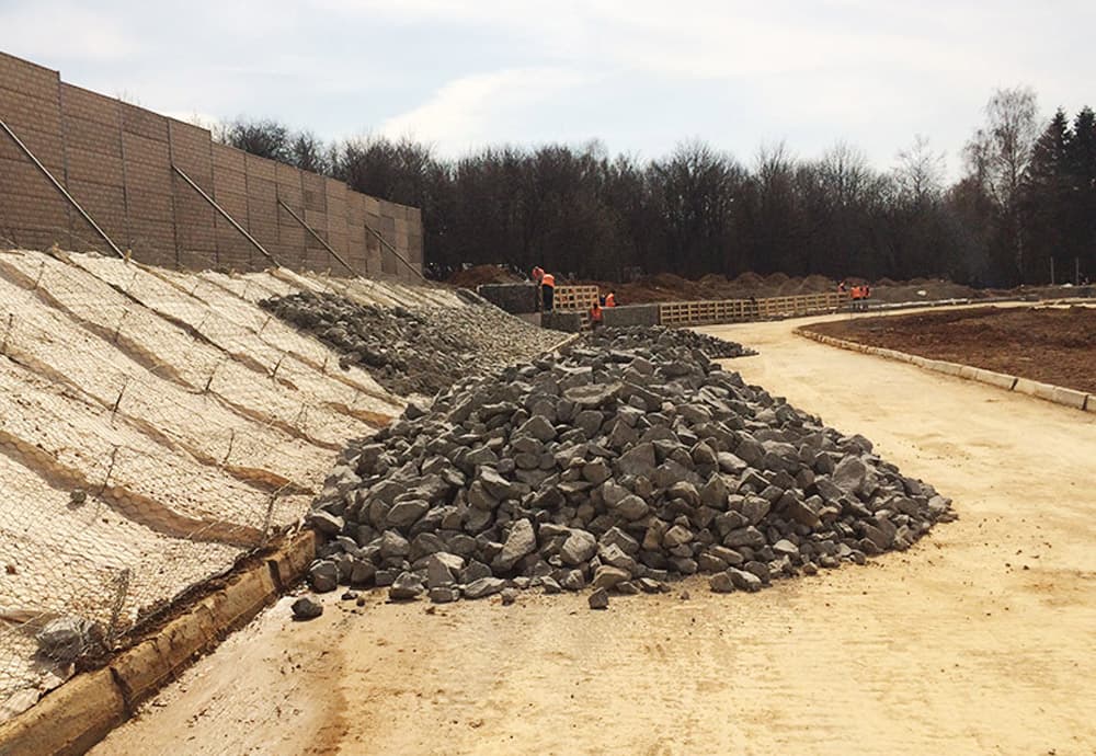 Опытные работники компании «Геопродукт» укрепили откос с помощью габионов и геотекстиля. Геотекстиль использовался для создания слоя, предотвращающего размытие грунта. Габионные конструкции образовали надежную подпорную стену, которая исключила разрушение откоса.